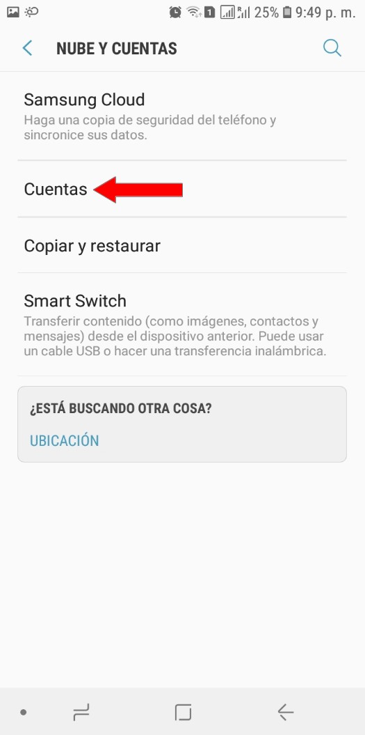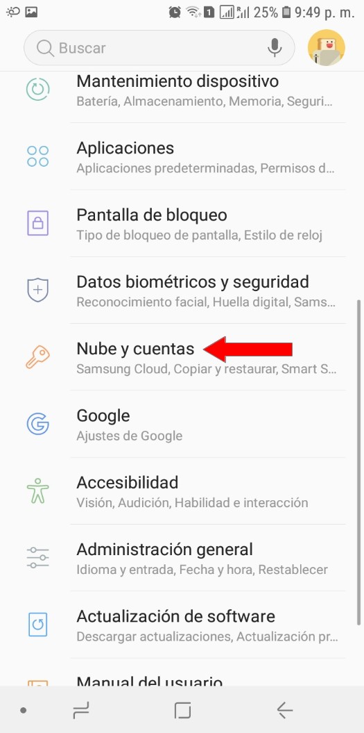 1. Ingresá a las configuraciones generales de tu dispositivo Android y presioná sobre "Nube y cuentas / Cuentas".