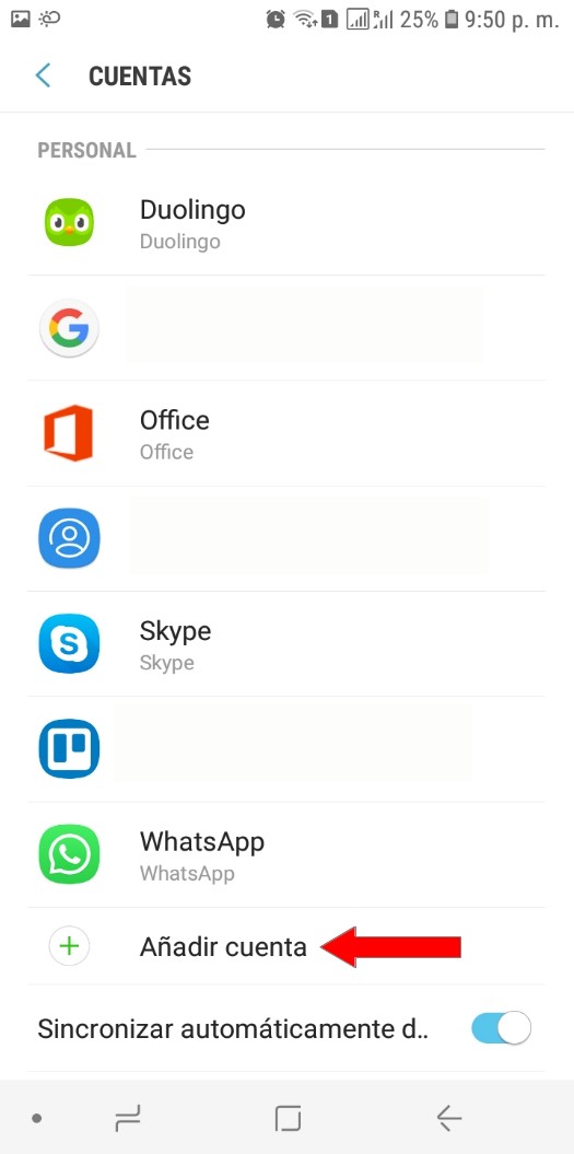 3. Veremos a continuación las cuentas que ya tenemos en el dispositivo. En este caso presionaremos sobre la opción de "Añadir Cuenta".