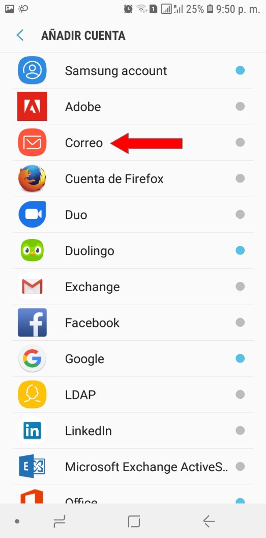 4. Especificaremos que queremos configurar una casilla de correo, para ello, presionaremos sobre la opción "Correo".
