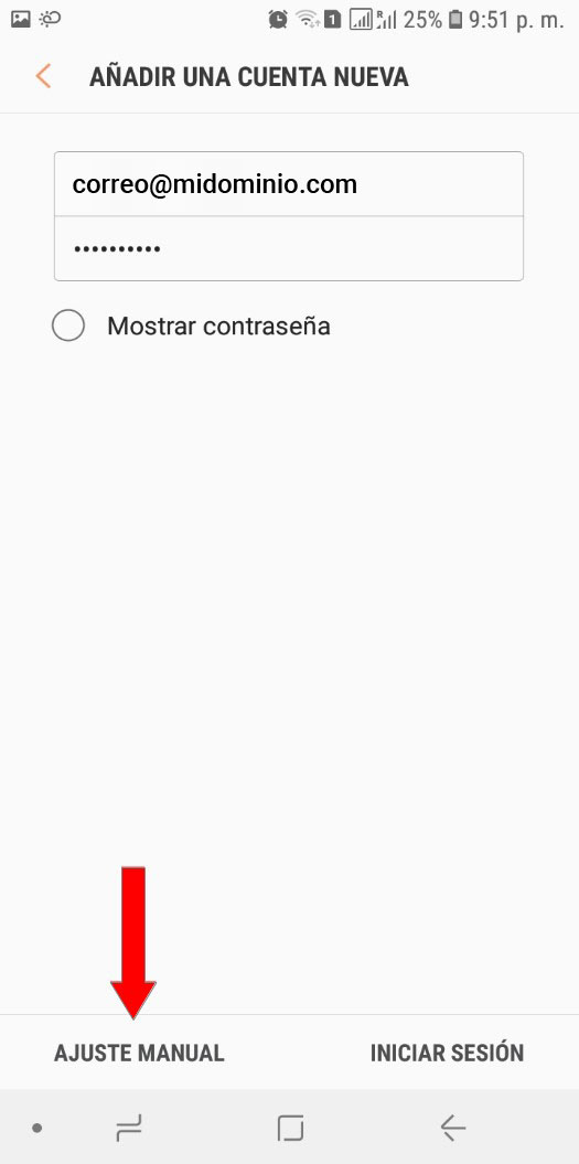 5. En la siguiente ventana ingresaremos los datos de usuario y contraseña. Una vez rellenados estos datos presionaremos sobre la opción "AJUSTE MANUAL".