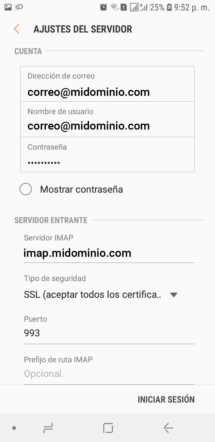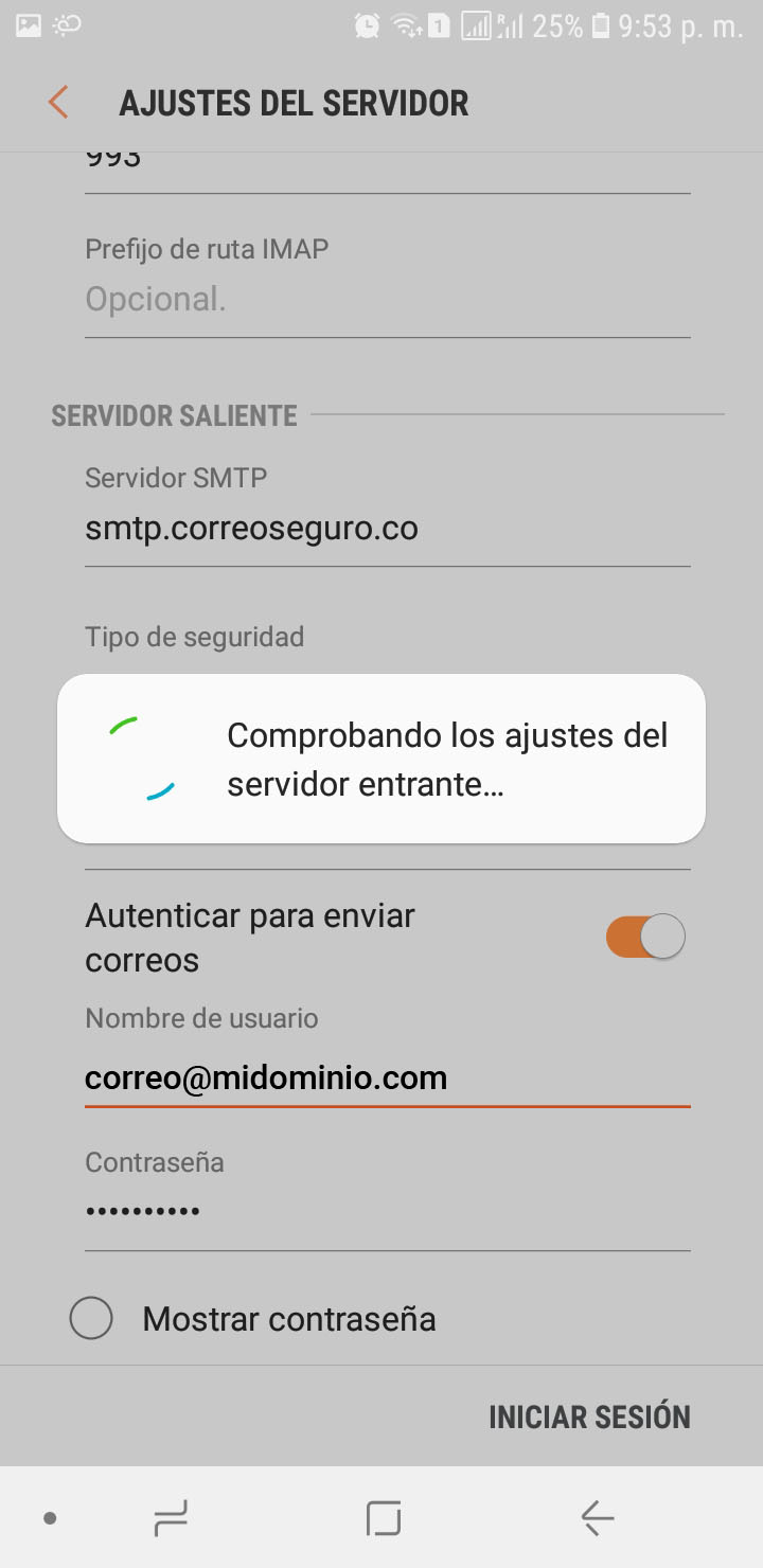 9. Después de configurar los ajustes para el servidor de entrada y salida verificá que hayas escrito bien el nombre de usuario y contraseña y a continuación presiona el botón "INICIAR SESIÓN". El sistema entonces empezará a verificar los ajustes configurados.